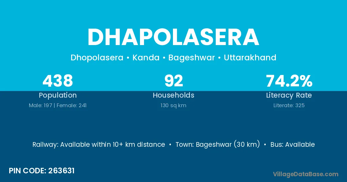 Bageshwar (30 km) is the nearest town to Dhapolasera village for major economic activities and is located approximately 30 km away.