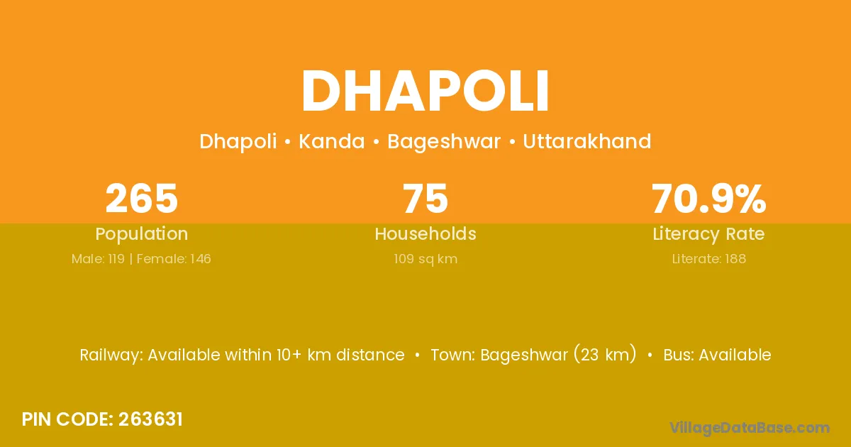 Bageshwar (23 km) is the nearest town to Dhapoli village for major economic activities and is located approximately 23 km away.
