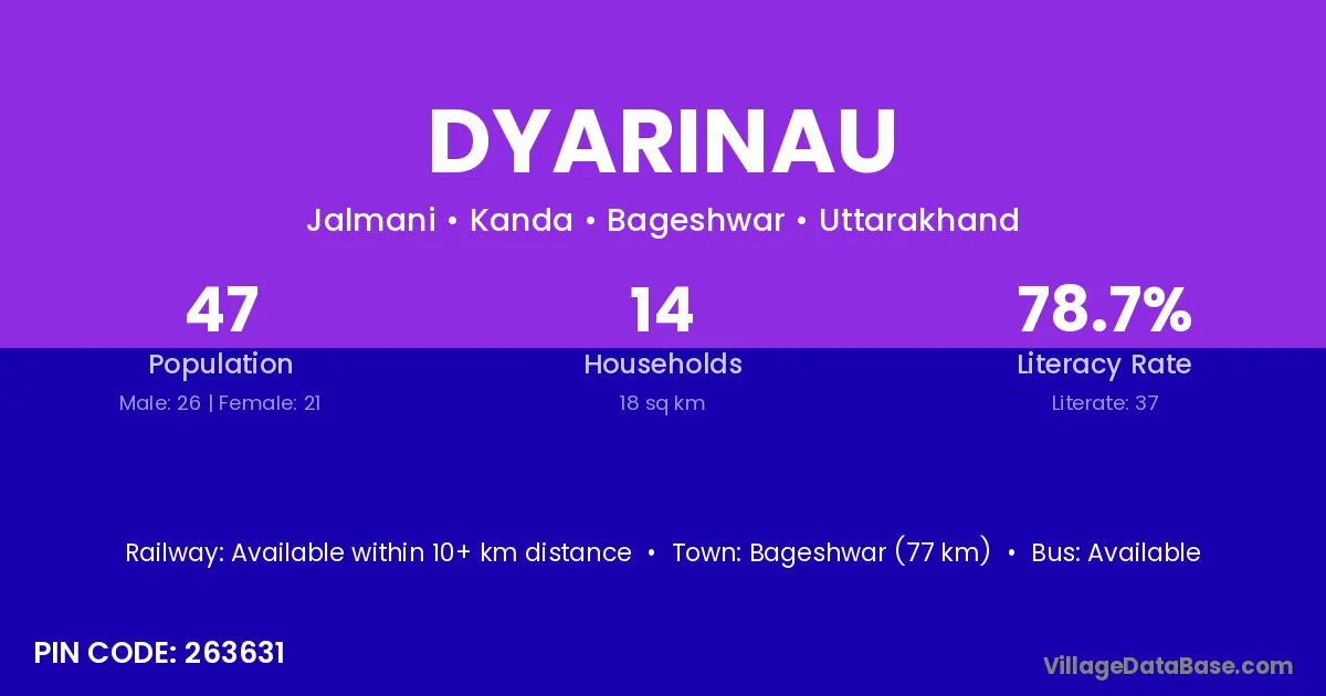 Bageshwar (77 km) is the nearest town to Dyarinau village for major economic activities and is located approximately 77 km away.