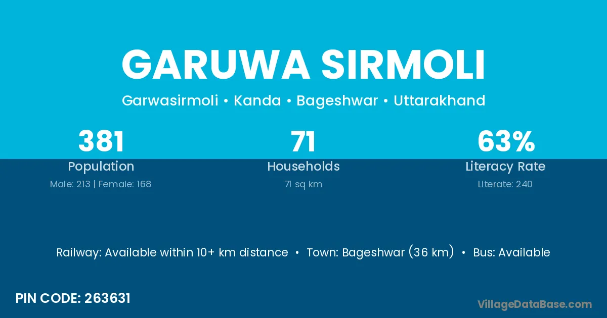 Bageshwar (36 km) is the nearest town to Garuwa Sirmoli village for major economic activities and is located approximately 36 km away.