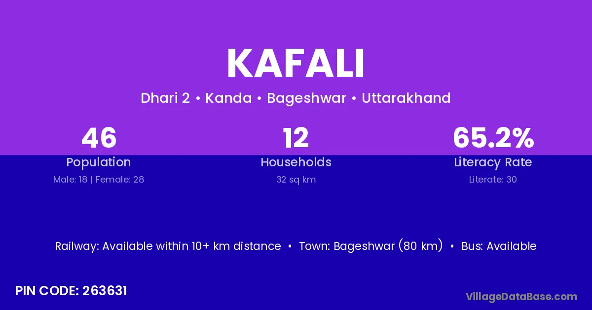 Bageshwar (80 km) is the nearest town to Kafali village for major economic activities and is located approximately 80 km away.