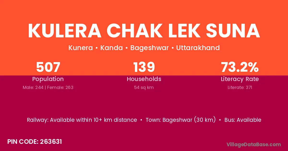 Bageshwar (30 km) is the nearest town to Kulera Chak Lek Suna village for major economic activities and is located approximately 30 km away.
