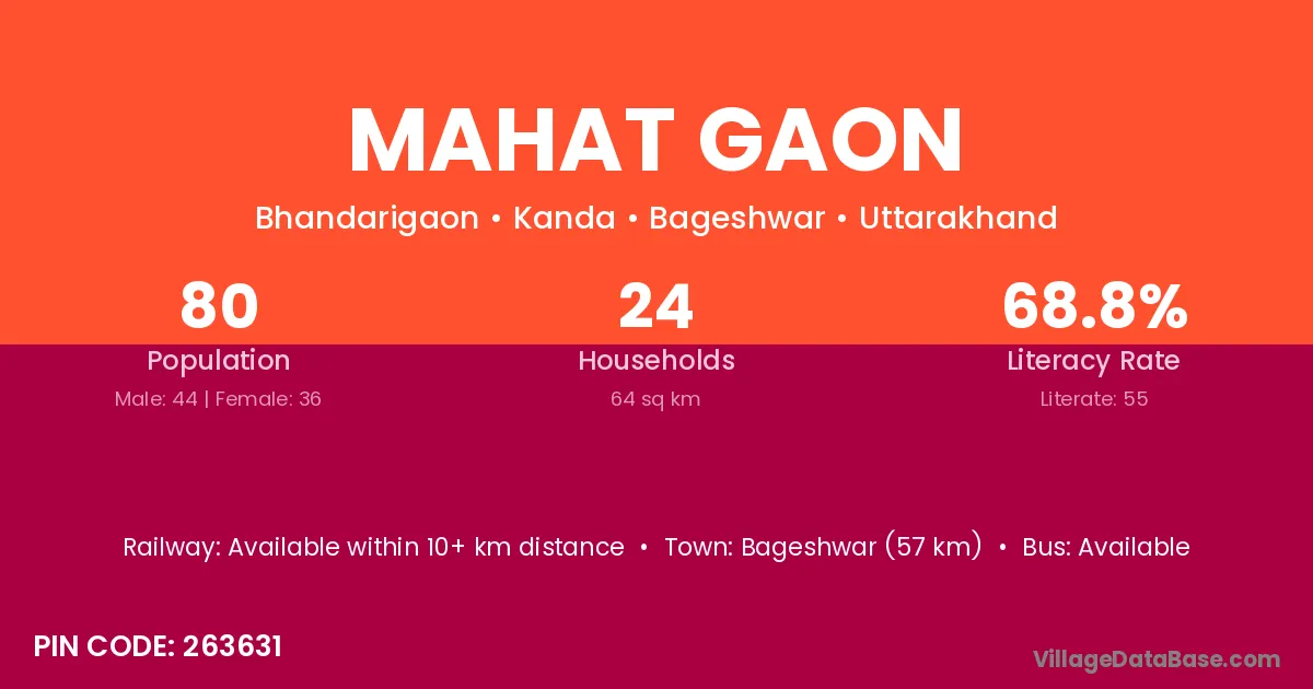 Bageshwar (57 km) is the nearest town to Mahat Gaon village for major economic activities and is located approximately 57 km away.
