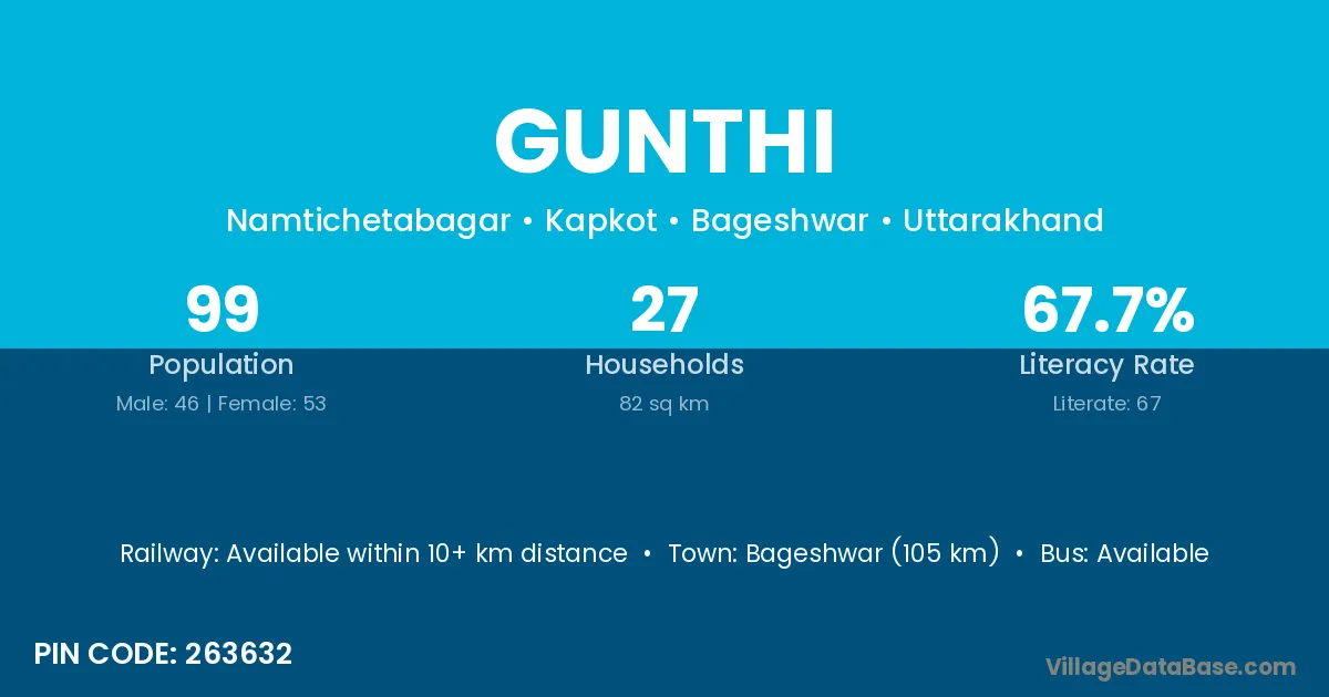 Bageshwar (105 km) is the nearest town to Gunthi village for major economic activities and is located approximately 105 km away.