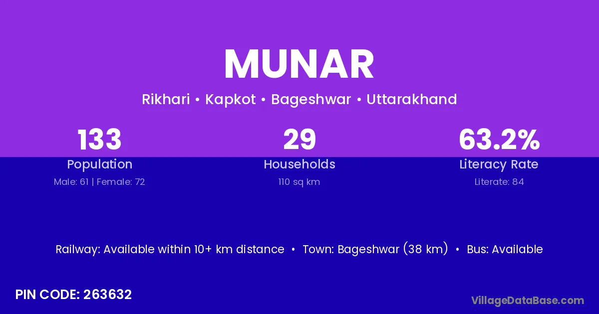 Bageshwar (38 km) is the nearest town to Munar village for major economic activities and is located approximately 38 km away.