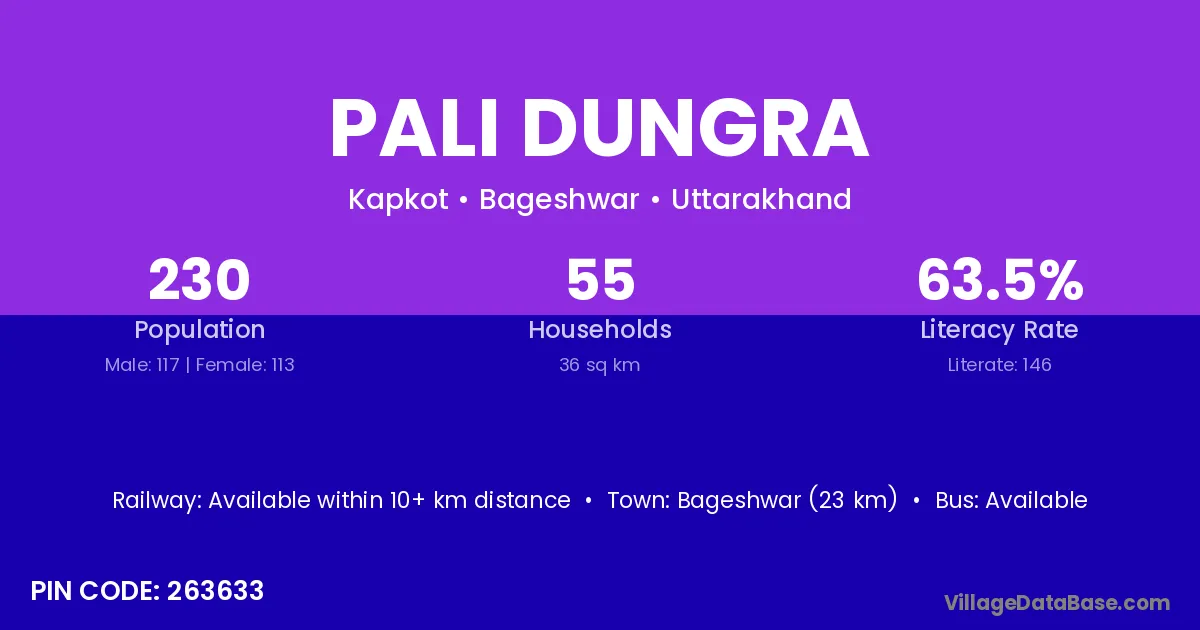 Bageshwar (23 km) is the nearest town to Pali Dungra village for major economic activities and is located approximately 23 km away.
