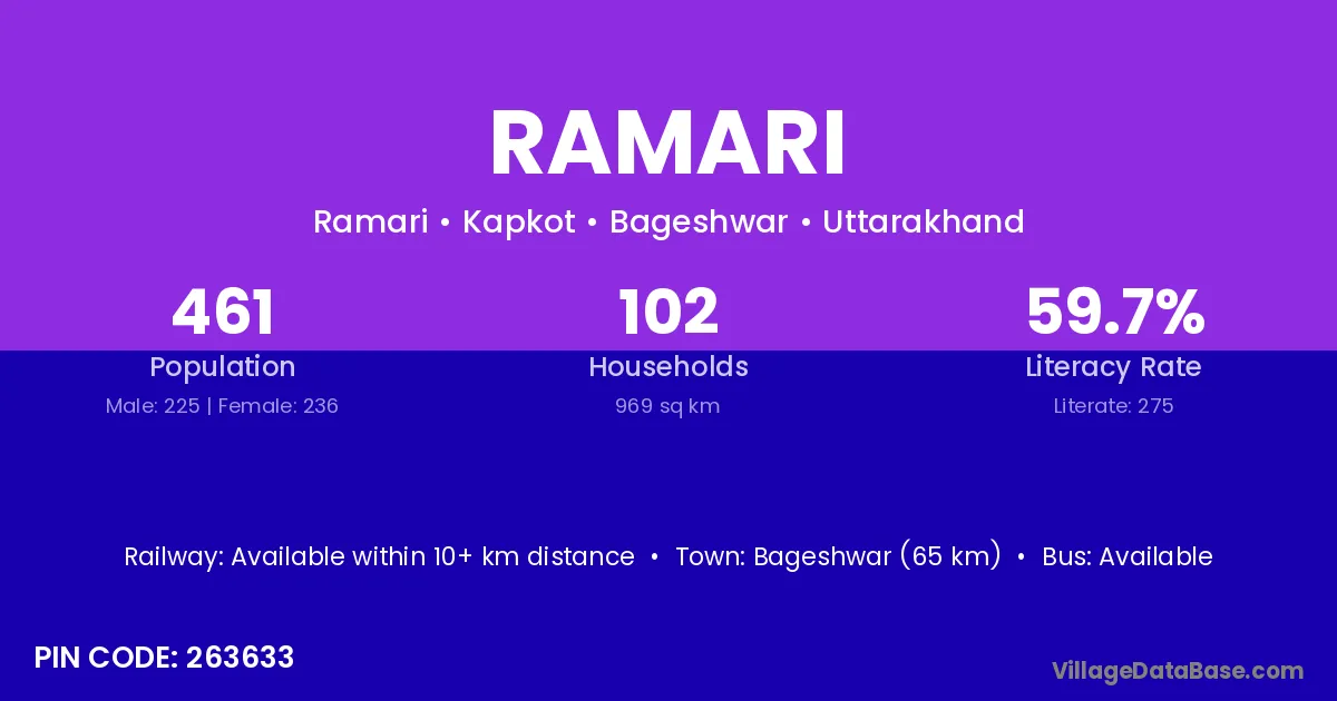 Bageshwar (65 km) is the nearest town to Ramari village for major economic activities and is located approximately 65 km away.