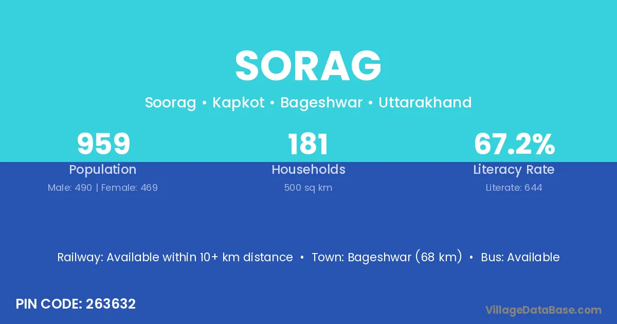 Bageshwar (68 km) is the nearest town to Sorag village for major economic activities and is located approximately 68 km away.