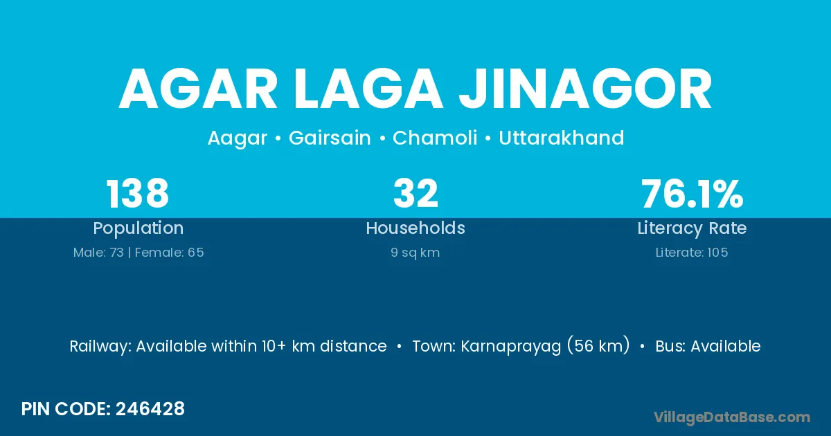 Karnaprayag (56 km) is the nearest town to Agar Laga Jinagor village for major economic activities and is located approximately 56 km away.