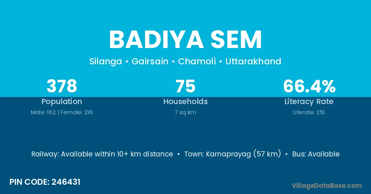 Karnaprayag (57 km) is the nearest town to Badiya Sem village for major economic activities and is located approximately 57 km away.
