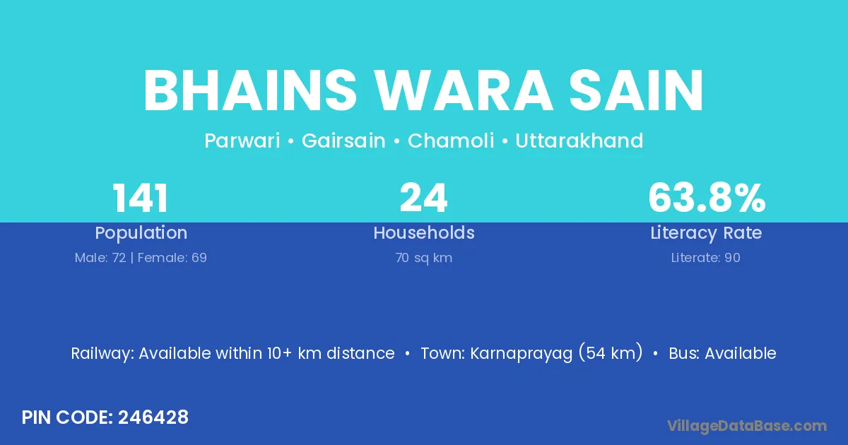 Karnaprayag (54 km) is the nearest town to Bhains Wara Sain village for major economic activities and is located approximately 54 km away.