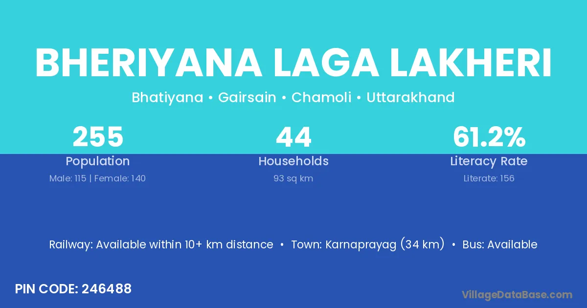 Karnaprayag (34 km) is the nearest town to Bheriyana Laga Lakheri village for major economic activities and is located approximately 34 km away.