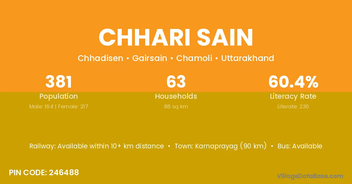 Karnaprayag (90 km) is the nearest town to Chhari Sain village for major economic activities and is located approximately 90 km away.