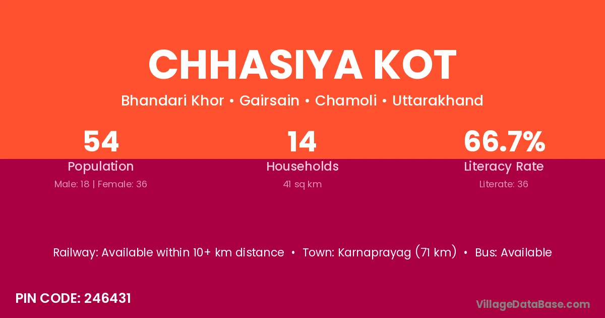 Karnaprayag (71 km) is the nearest town to Chhasiya Kot village for major economic activities and is located approximately 71 km away.