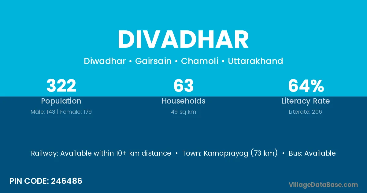 Karnaprayag (73 km) is the nearest town to Divadhar village for major economic activities and is located approximately 73 km away.