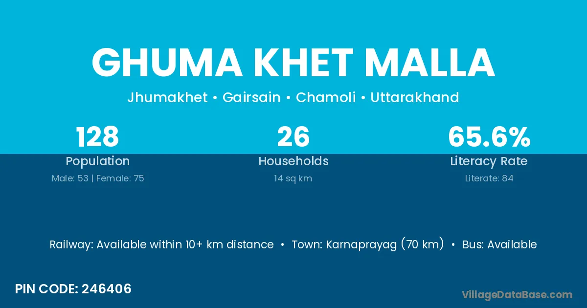 Ghuma Khet Malla village has a total population of 128 people, of which 53 are males and 75 are females.