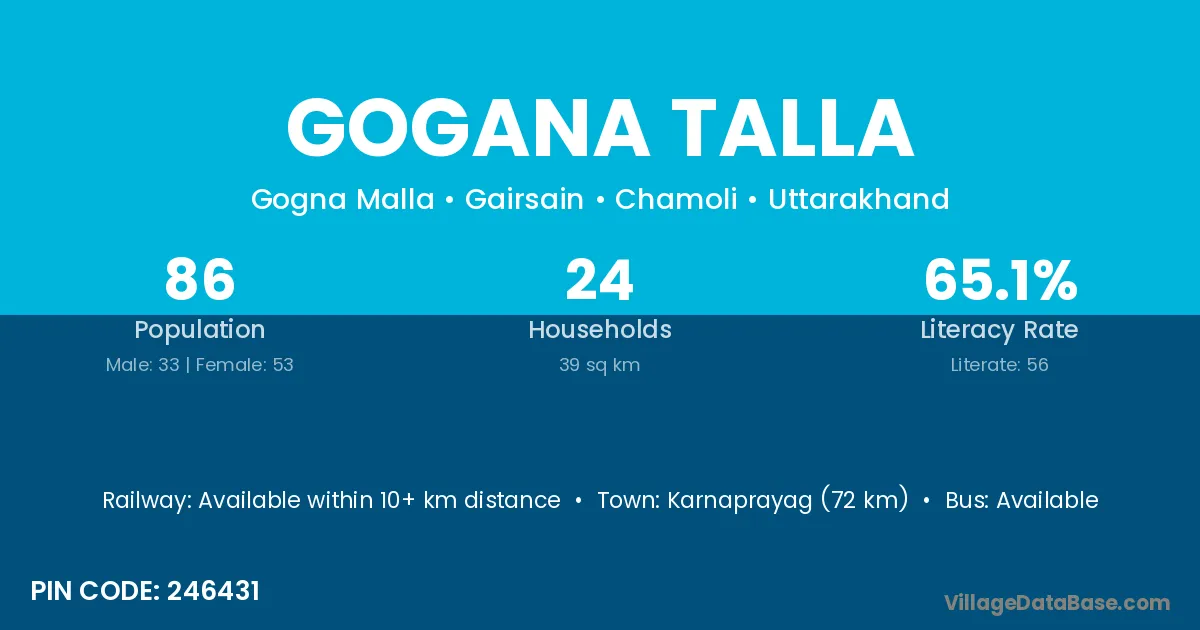 Karnaprayag (72 km) is the nearest town to Gogana Talla village for major economic activities and is located approximately 72 km away.