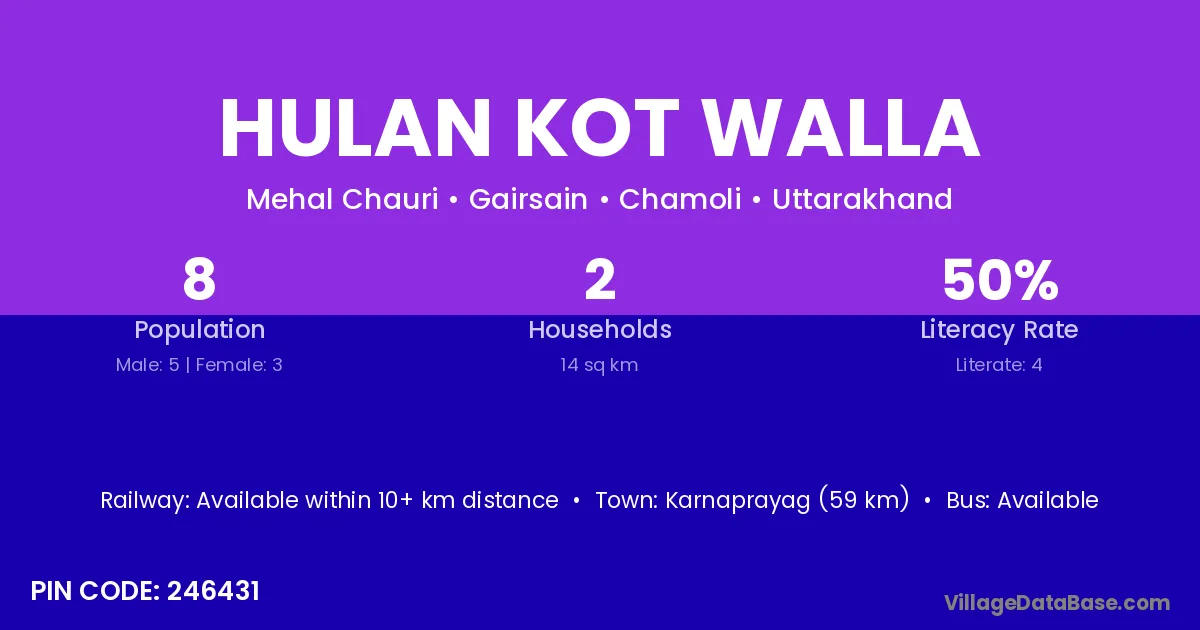 Karnaprayag (59 km) is the nearest town to Hulan Kot Walla village for major economic activities and is located approximately 59 km away.
