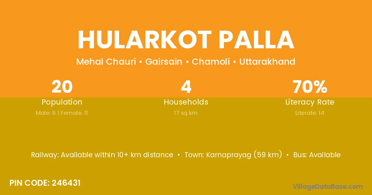 Karnaprayag (59 km) is the nearest town to Hularkot Palla village for major economic activities and is located approximately 59 km away.