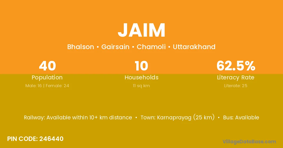 Karnaprayag (25 km) is the nearest town to Jaim village for major economic activities and is located approximately 25 km away.