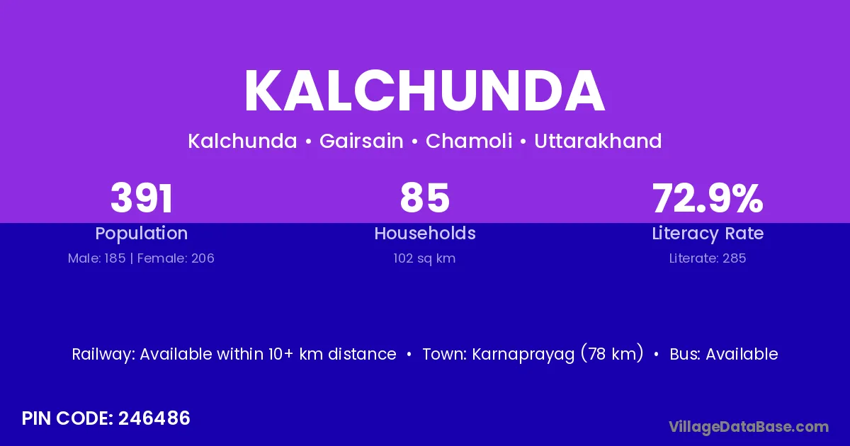 Karnaprayag (78 km) is the nearest town to Kalchunda village for major economic activities and is located approximately 78 km away.