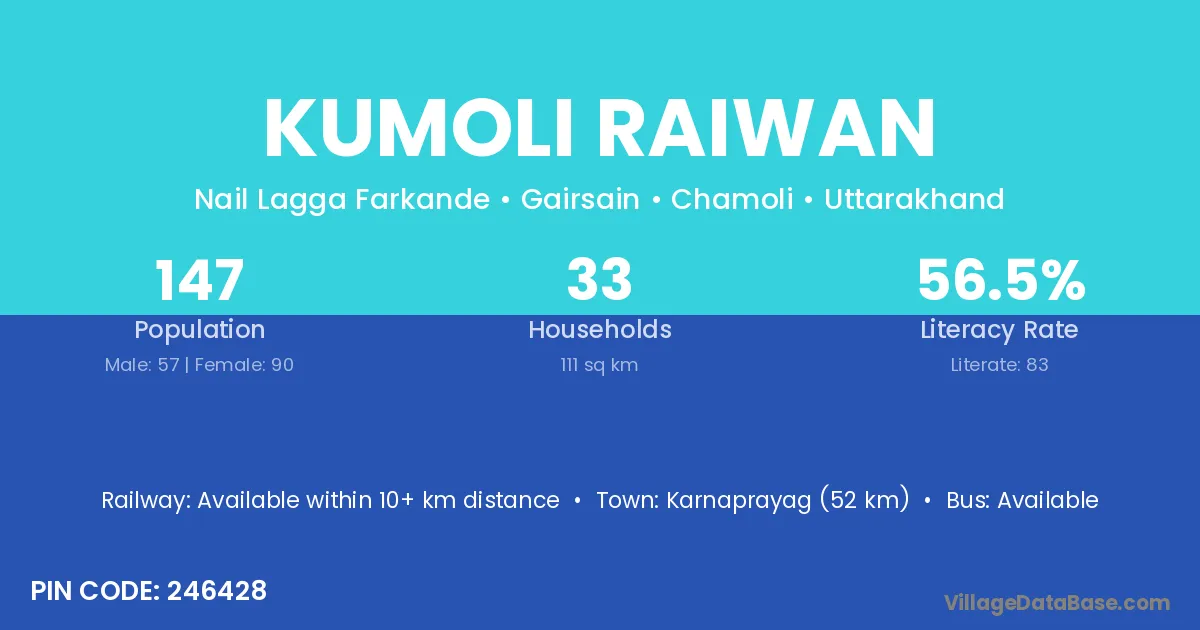 Karnaprayag (52 km) is the nearest town to Kumoli Raiwan village for major economic activities and is located approximately 52 km away.