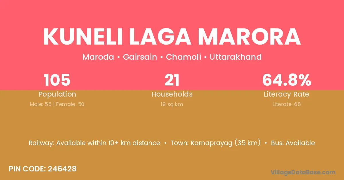 Karnaprayag (35 km) is the nearest town to Kuneli Laga Marora village for major economic activities and is located approximately 35 km away.