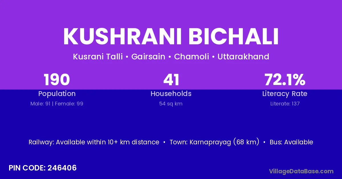 Karnaprayag (68 km) is the nearest town to Kushrani Bichali village for major economic activities and is located approximately 68 km away.