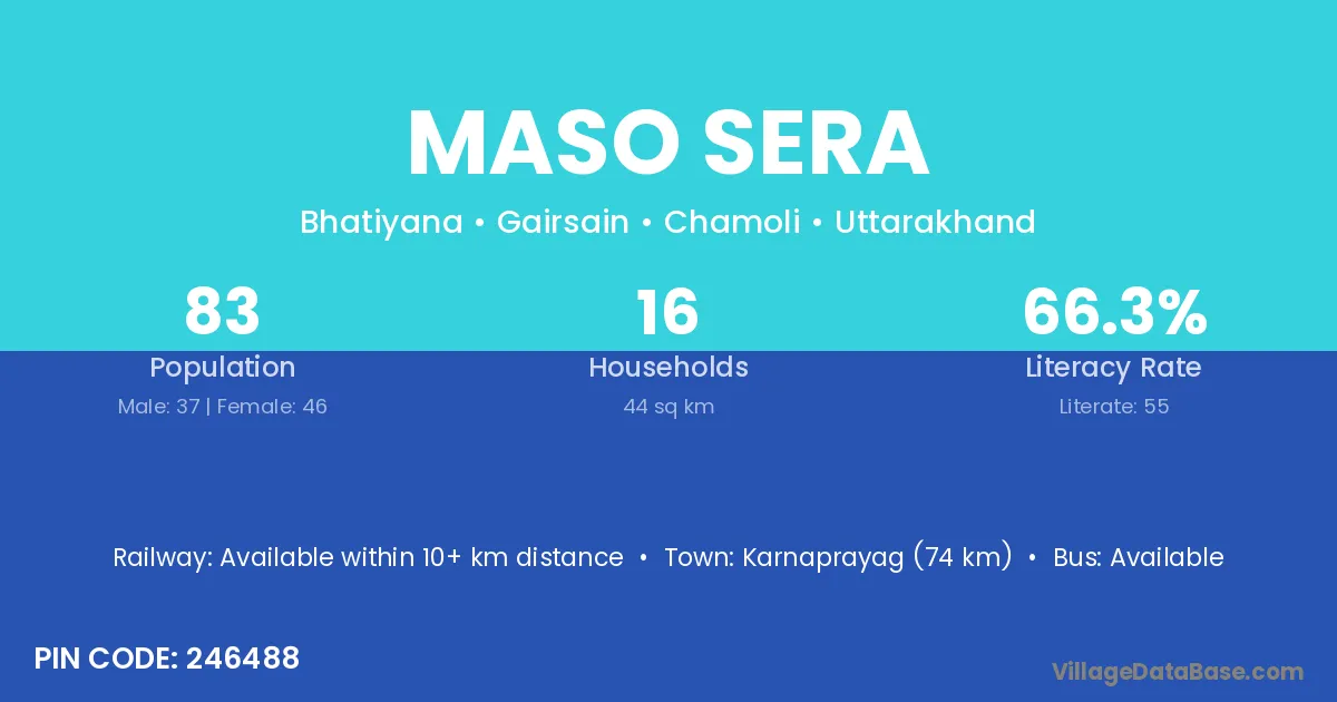 Karnaprayag (74 km) is the nearest town to Maso Sera village for major economic activities and is located approximately 74 km away.