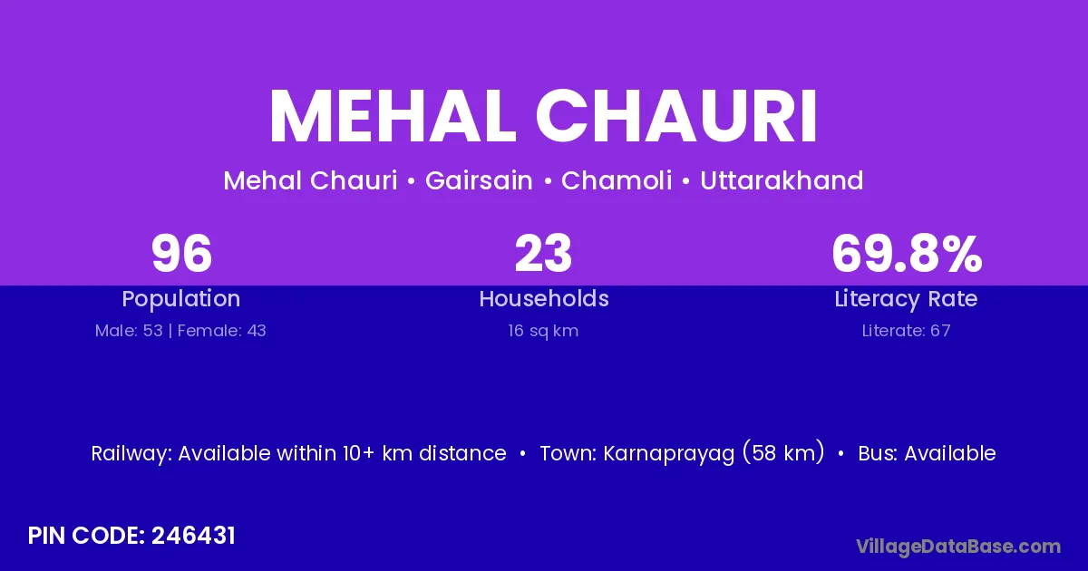 Karnaprayag (58 km) is the nearest town to Mehal Chauri village for major economic activities and is located approximately 58 km away.