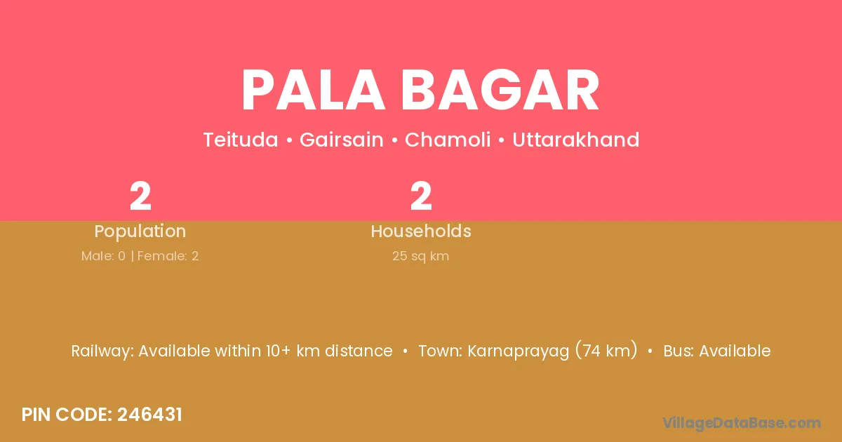 Karnaprayag (74 km) is the nearest town to Pala Bagar village for major economic activities and is located approximately 74 km away.