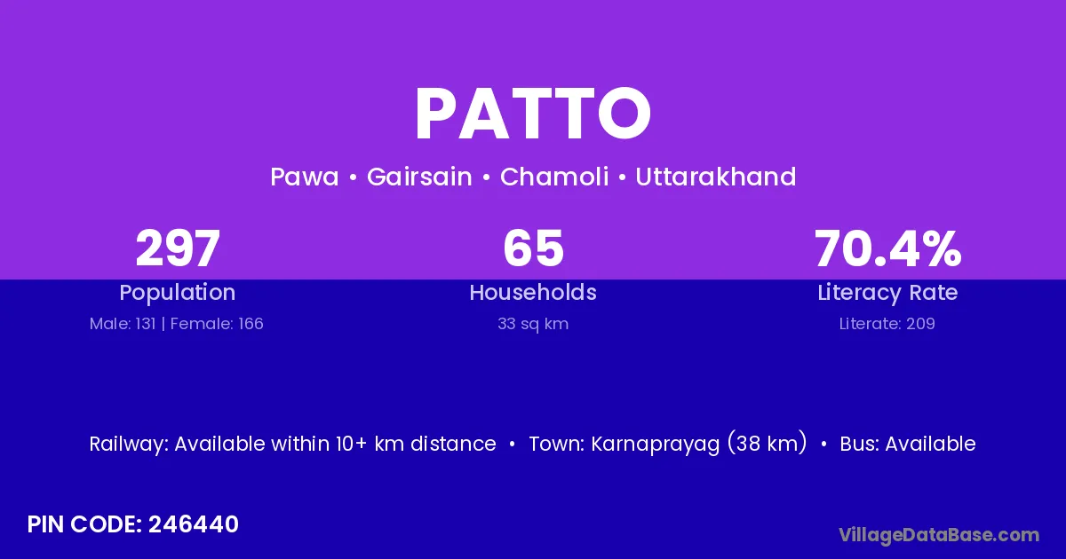 Karnaprayag (38 km) is the nearest town to Patto village for major economic activities and is located approximately 38 km away.