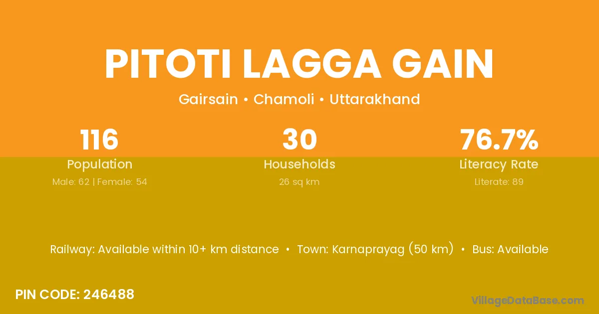 Karnaprayag (50 km) is the nearest town to Pitoti Lagga Gain village for major economic activities and is located approximately 50 km away.