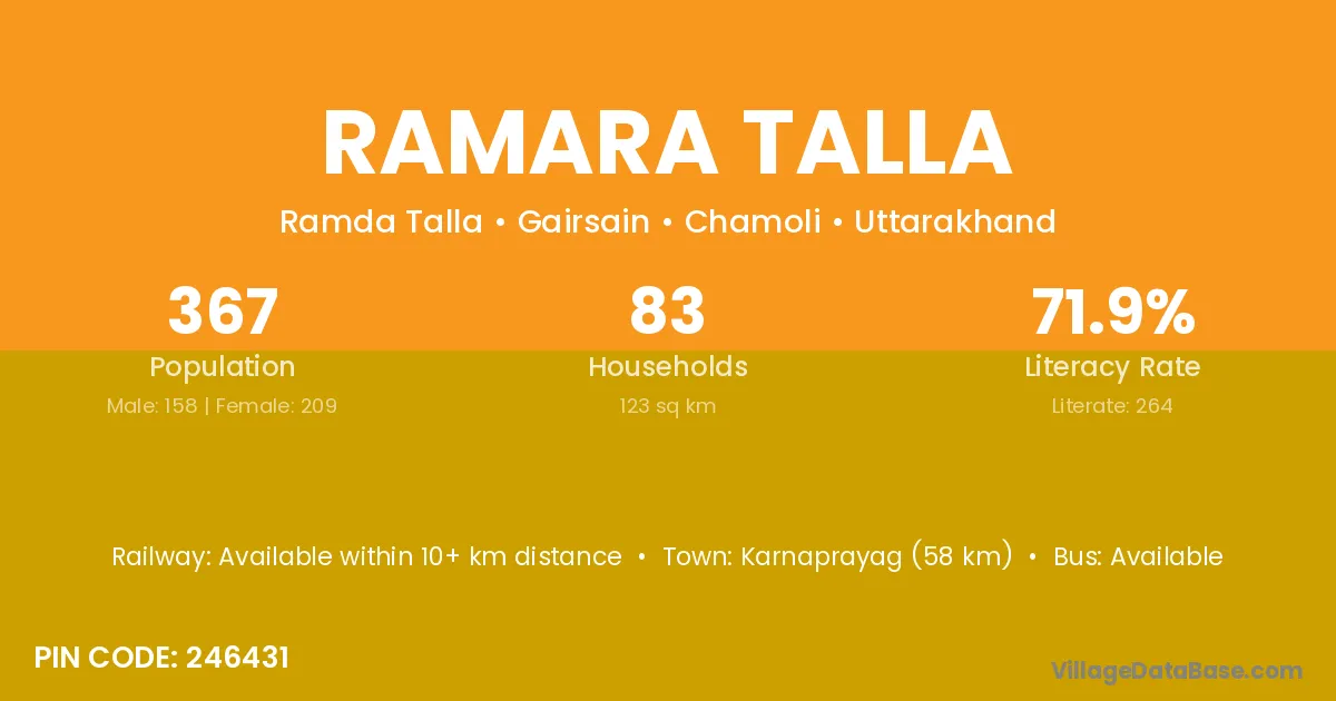 Karnaprayag (58 km) is the nearest town to Ramara Talla village for major economic activities and is located approximately 58 km away.
