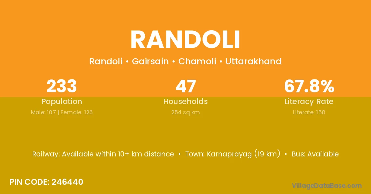 Karnaprayag (19 km) is the nearest town to Randoli village for major economic activities and is located approximately 19 km away.