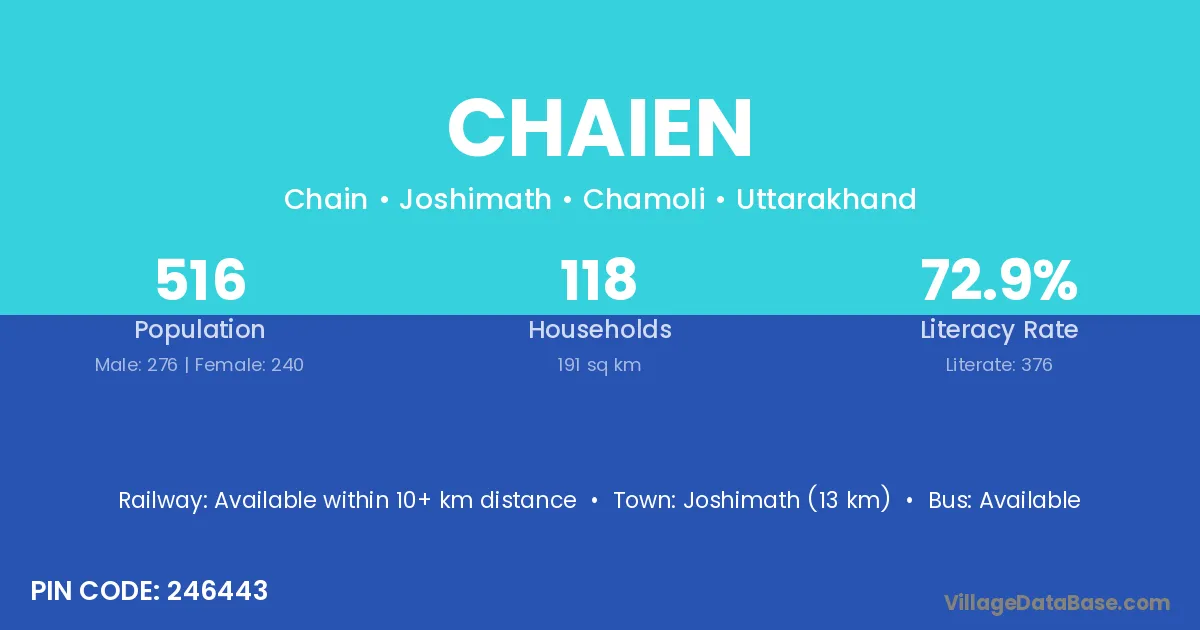 Joshimath (13 km) is the nearest town to Chaien village for major economic activities and is located approximately 13 km away.