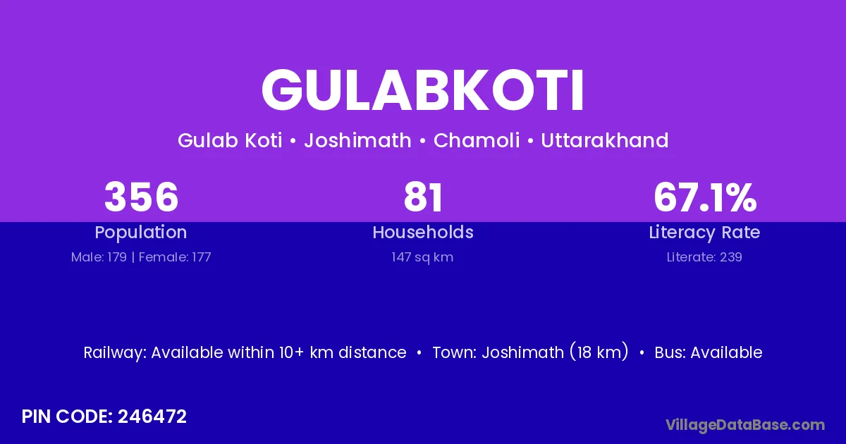 Joshimath (18 km) is the nearest town to Gulabkoti village for major economic activities and is located approximately 18 km away.