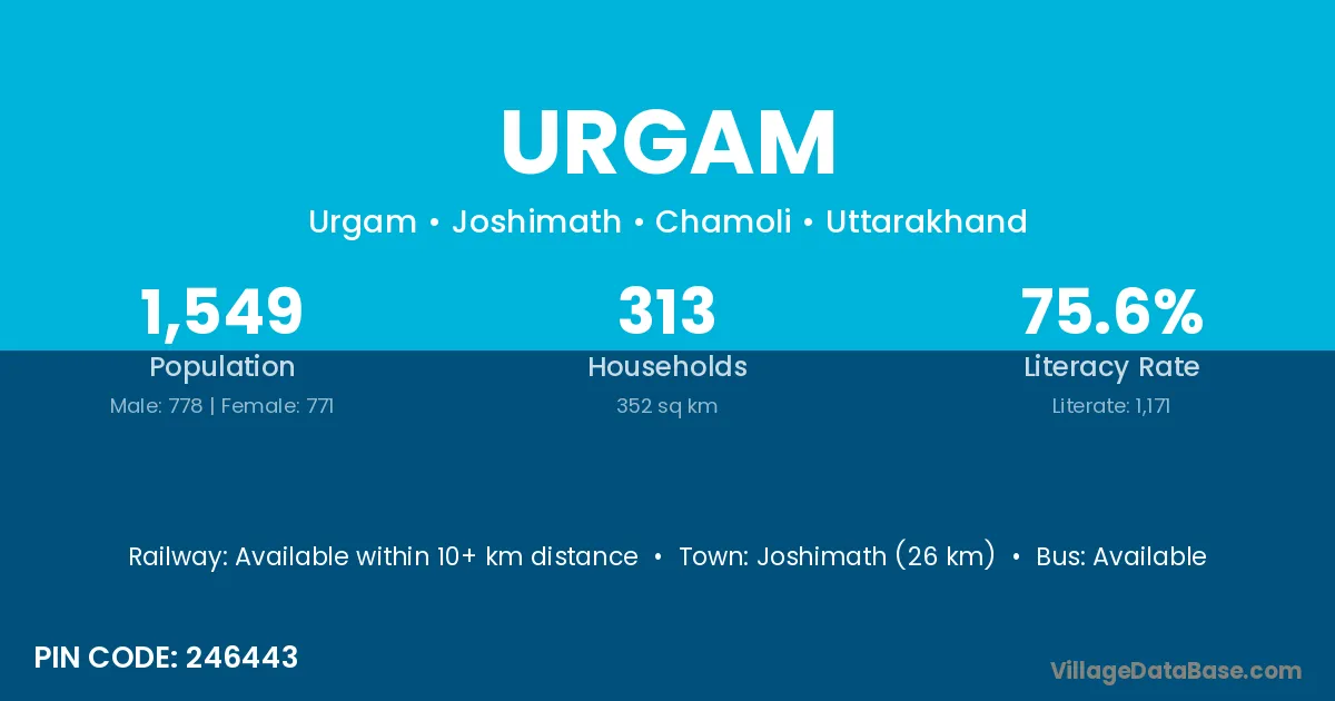 Joshimath (26 km) is the nearest town to Urgam village for major economic activities and is located approximately 26 km away.