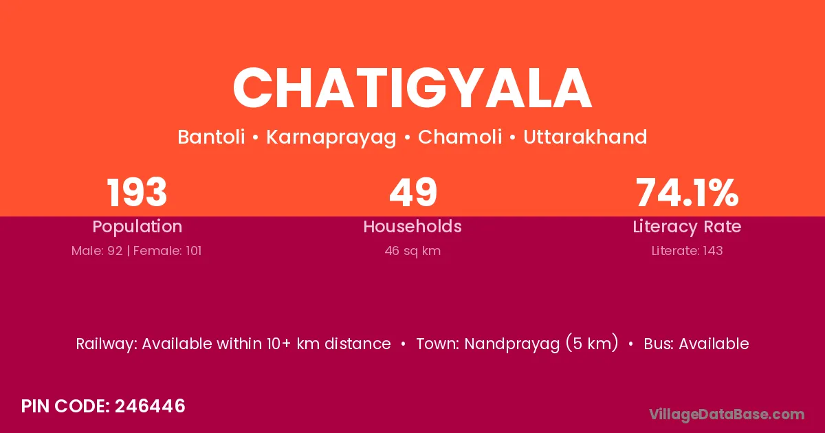Nandprayag (5 km) is the nearest town to Chatigyala village for major economic activities and is located approximately 5 km away.