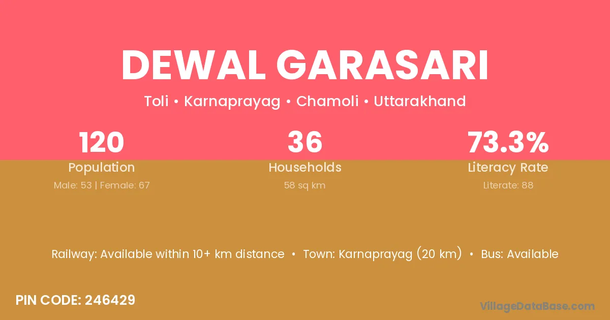 Karnaprayag (20 km) is the nearest town to Dewal Garasari village for major economic activities and is located approximately 20 km away.