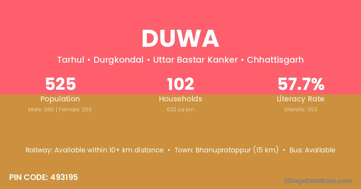 The literacy rate of Duwa village is 70.39%. Male literacy stands at 80.51% and female literacy at 60.00%.
