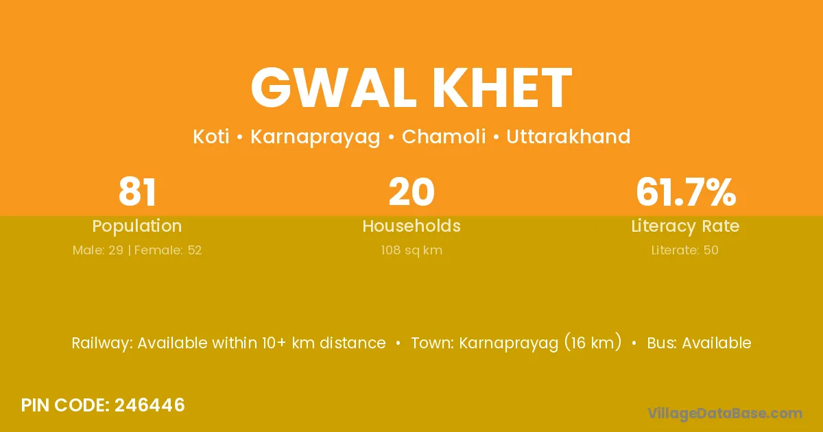 Karnaprayag (16 km) is the nearest town to Gwal Khet village for major economic activities and is located approximately 16 km away.