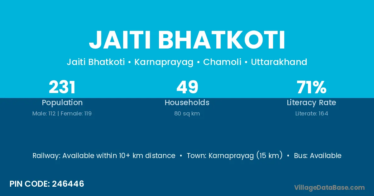 Karnaprayag (15 km) is the nearest town to Jaiti Bhatkoti village for major economic activities and is located approximately 15 km away.