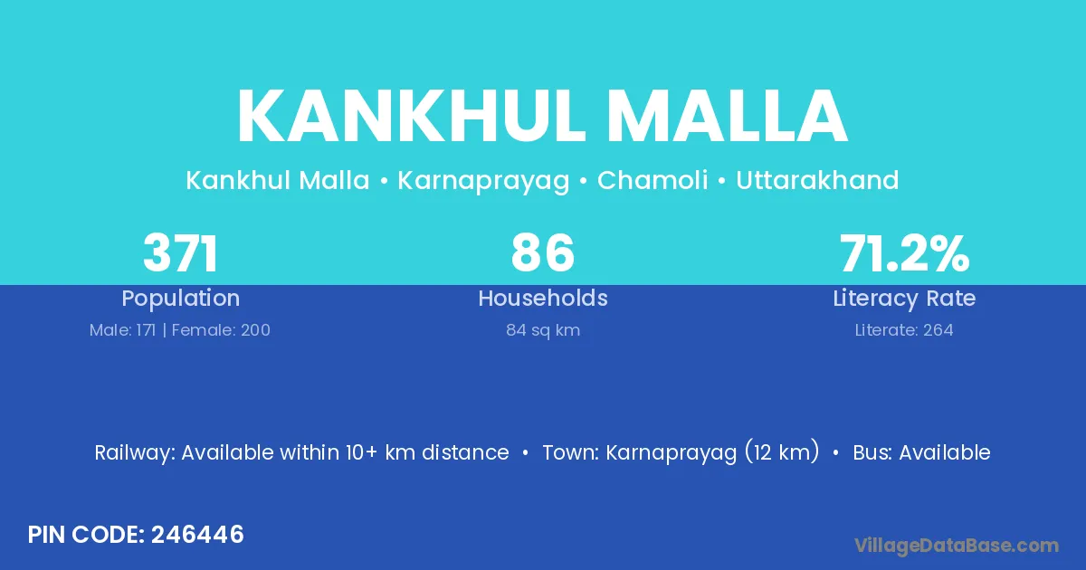 Karnaprayag (12 km) is the nearest town to Kankhul Malla village for major economic activities and is located approximately 12 km away.