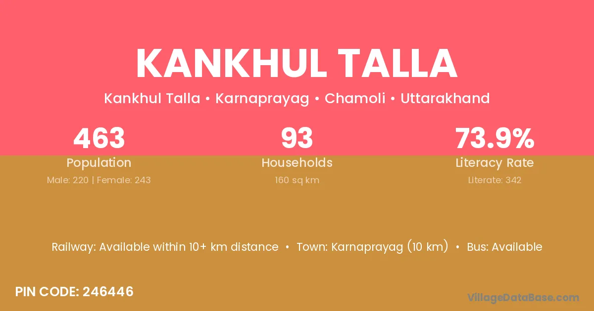 Karnaprayag (10 km) is the nearest town to Kankhul Talla village for major economic activities and is located approximately 10 km away.
