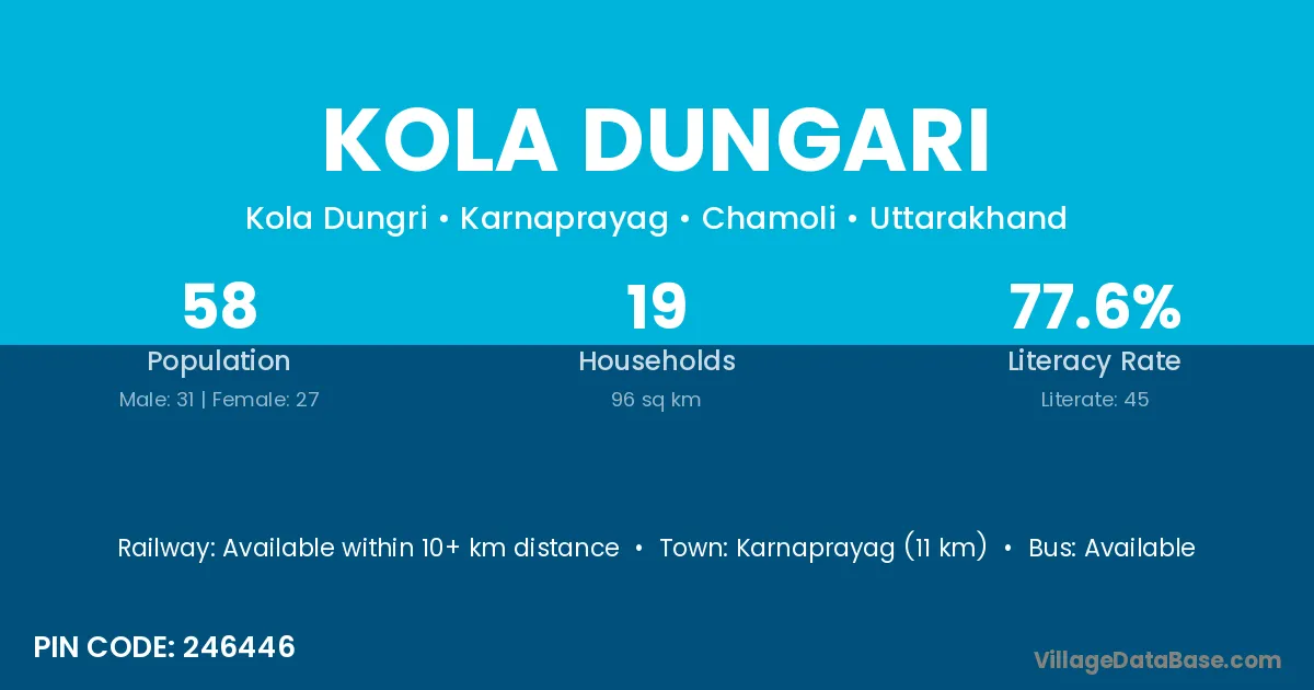 Karnaprayag (11 km) is the nearest town to Kola Dungari village for major economic activities and is located approximately 11 km away.