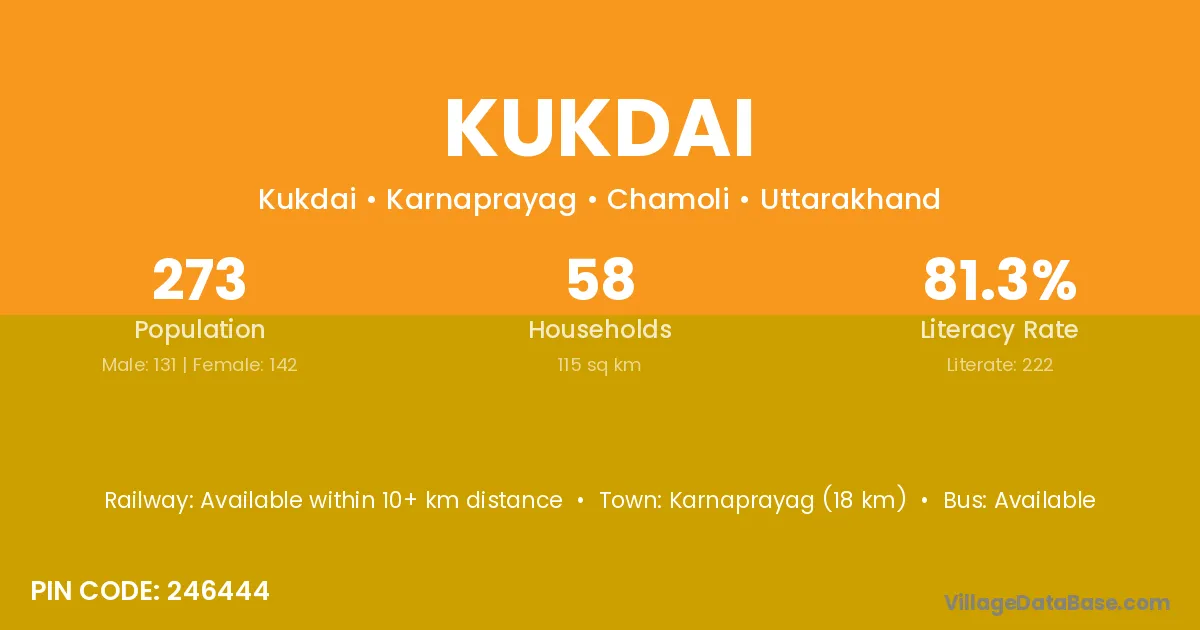 Karnaprayag (18 km) is the nearest town to Kukdai village for major economic activities and is located approximately 18 km away.