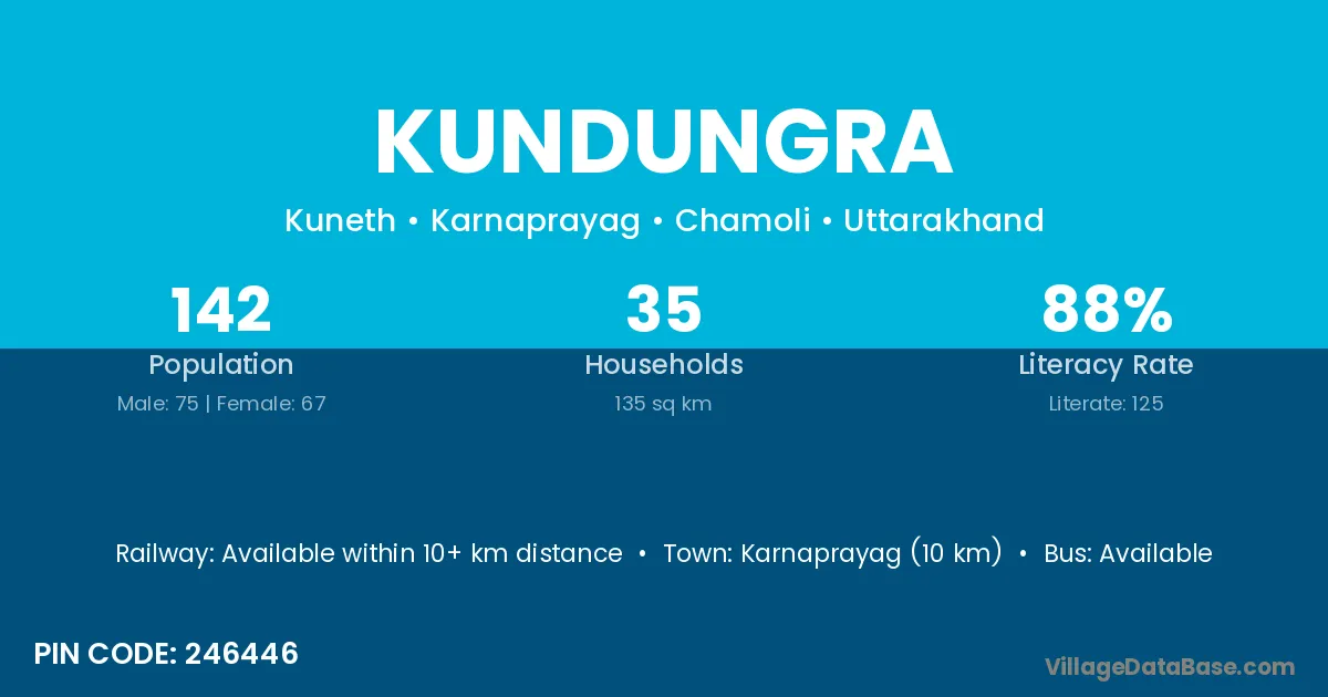 Karnaprayag (10 km) is the nearest town to Kundungra village for major economic activities and is located approximately 10 km away.