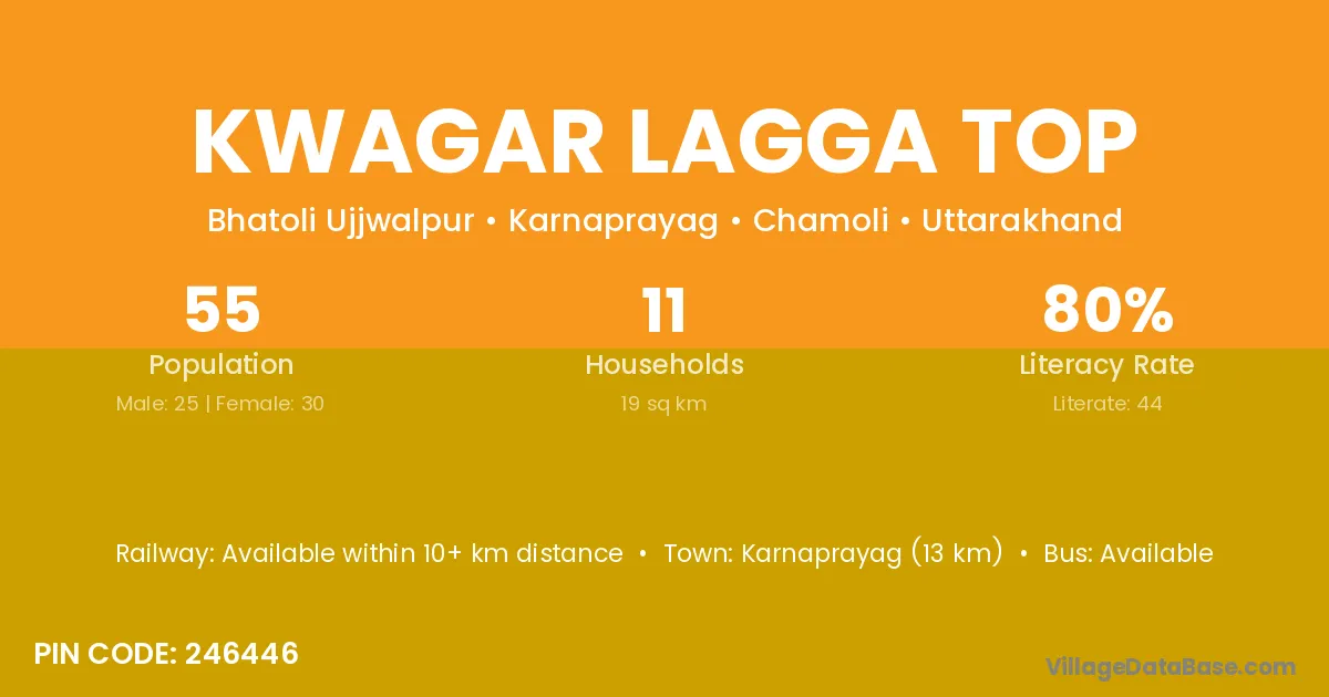 Karnaprayag (13 km) is the nearest town to Kwagar Lagga Top village for major economic activities and is located approximately 13 km away.