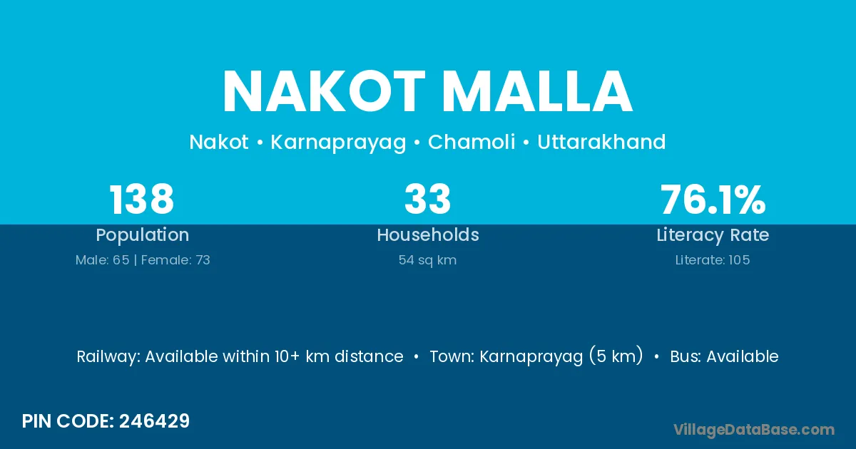 Karnaprayag (5 km) is the nearest town to Nakot Malla village for major economic activities and is located approximately 5 km away.
